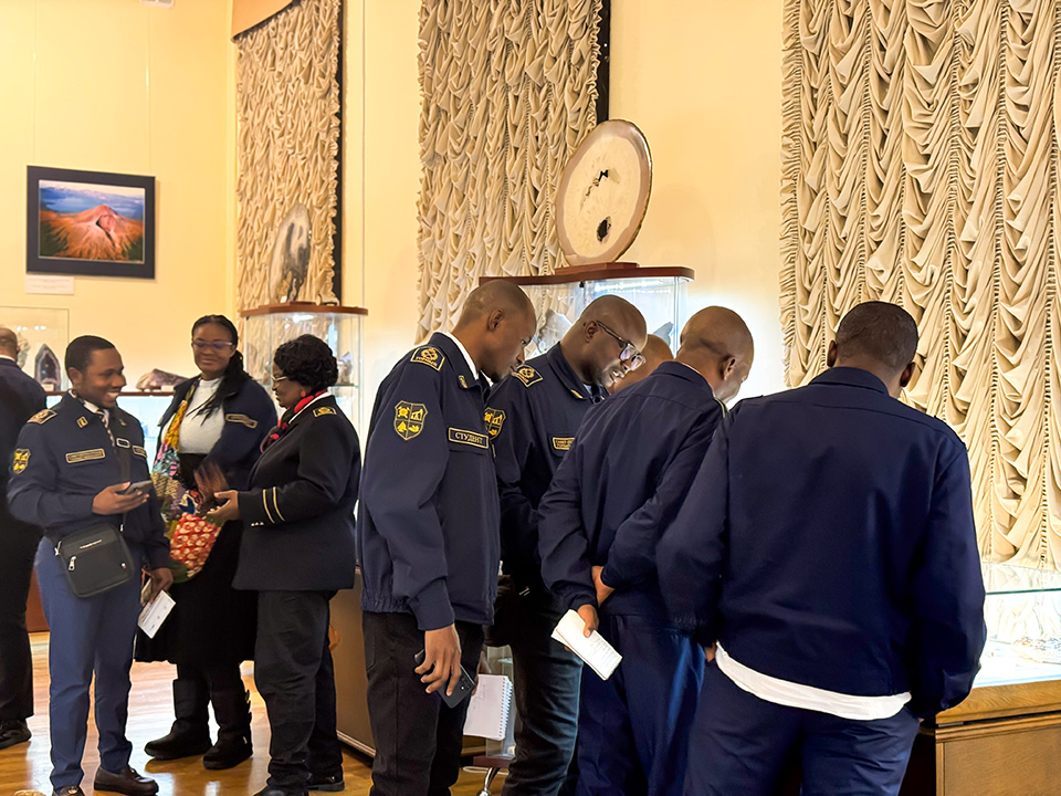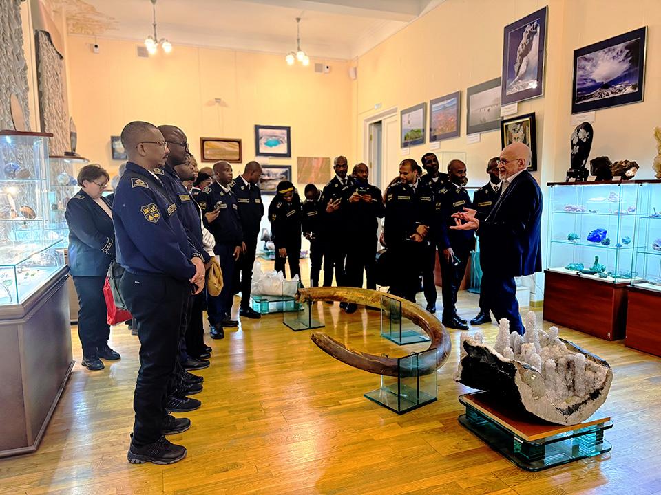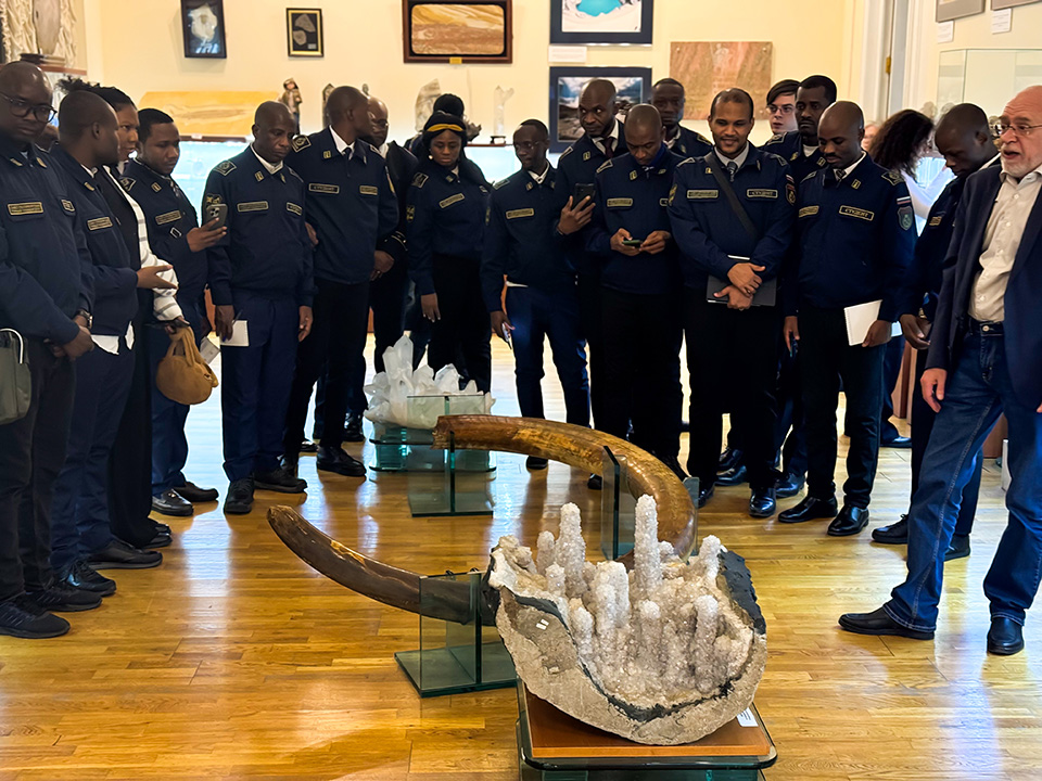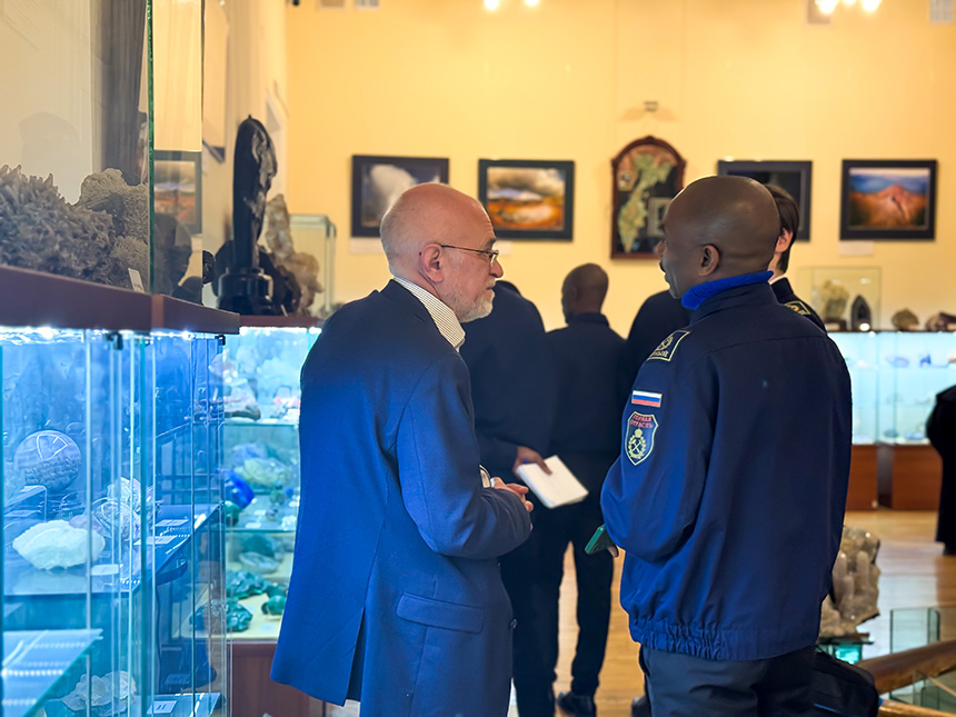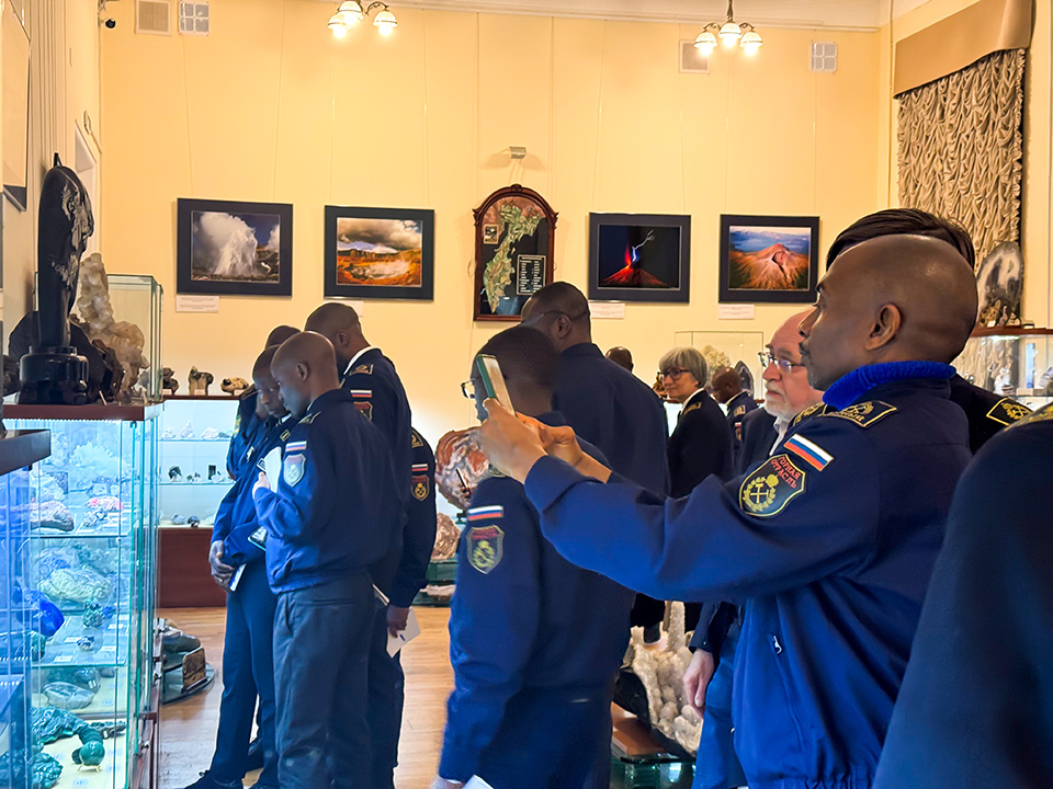 После официальной части участники встречи имели возможность ознакомиться с богатой коллекцией музея. Директор С.В. Черкасов провел экскурсию по залу Исторических коллекций, в котором представлены минералы и горные породы, ископаемые остатки животных и растений, собранные в конце XVIII – начале XX вв. выдающимися отечественными естествоиспытателями – профессорами Императорского Московского университета. Также гости посетили зал, где представлена коллекция С.М. Миронова.
